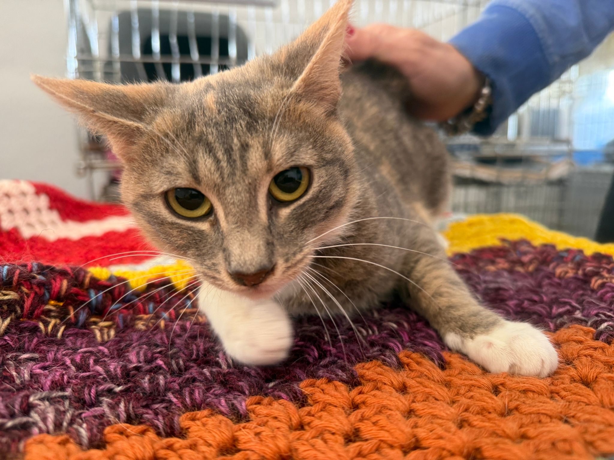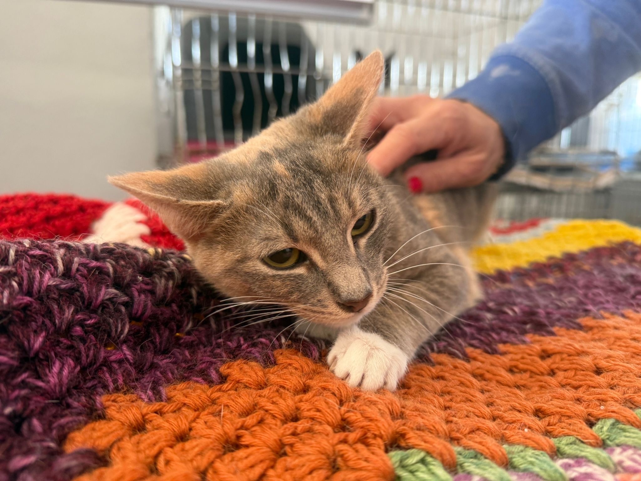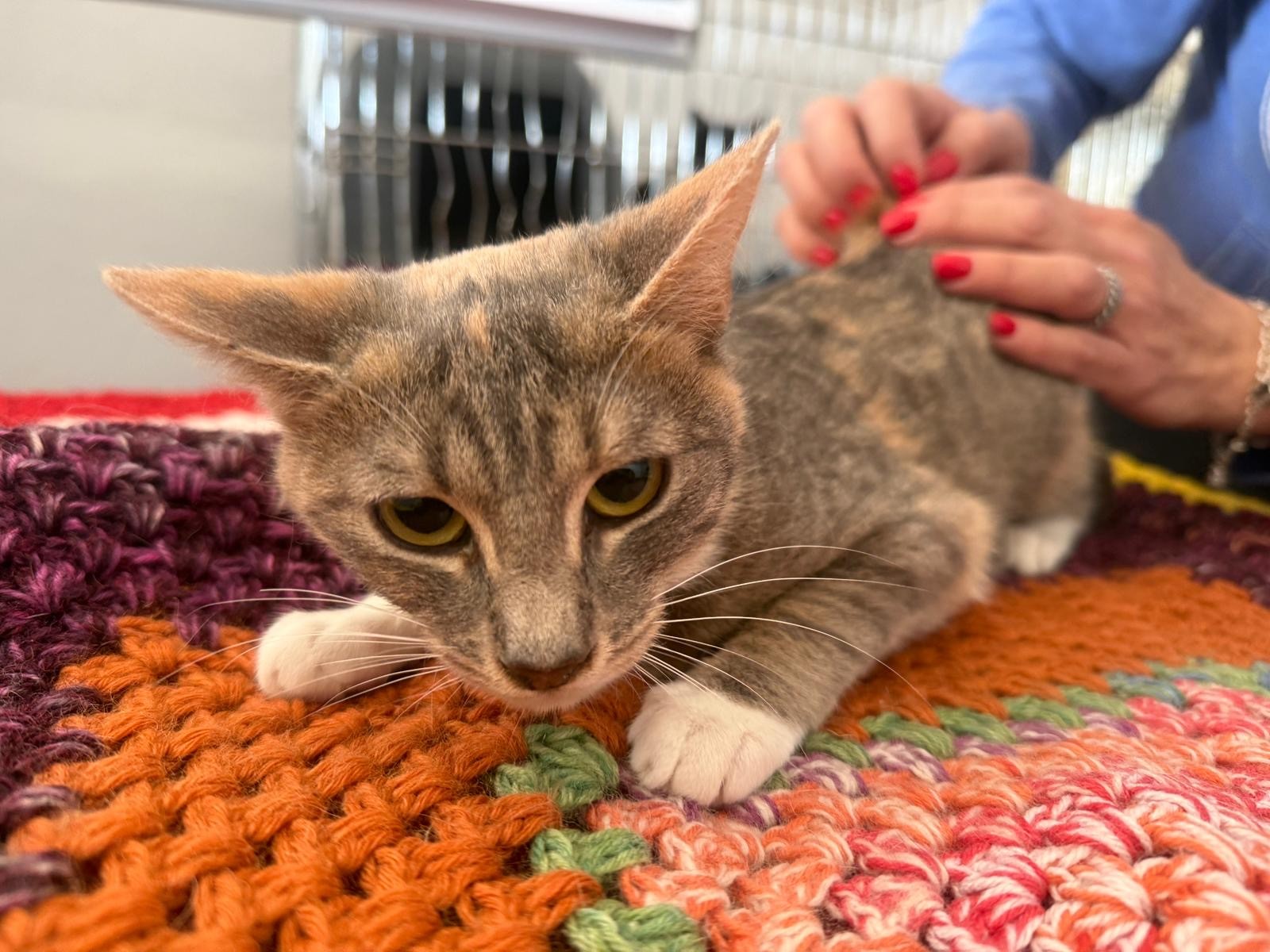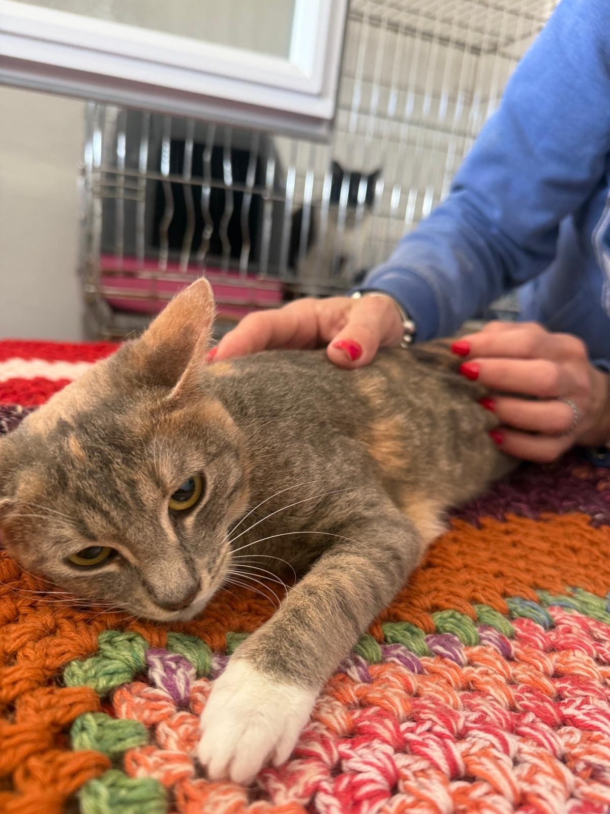 Schon bei ihrer Ankunft zeigte sich, dass Chrissi eine freundliche und sanfte Katze ist. Sie nähert sich Menschen ruhig und wirkt dabei aufmerksam und vorsichtig. In neuen Situationen beobachtet sie zunächst lieber in Ruhe, bevor sie Vertrauen fasst. Mit etwas Geduld und einer sicheren Umgebung wird sie sich sicher gut entwickeln und immer mehr von sich zeigen.