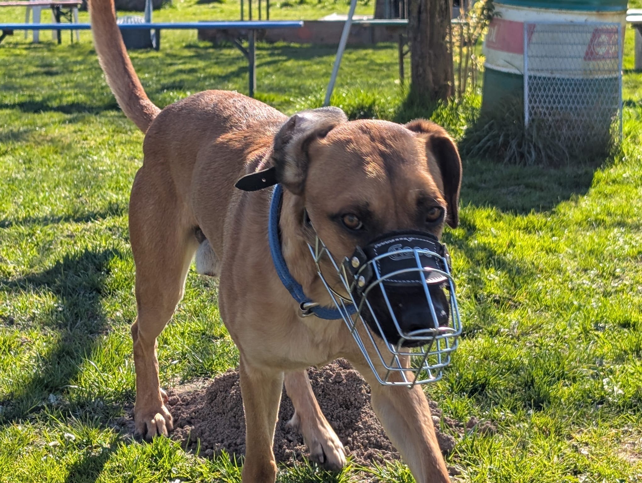 Er trägt bei Spaziergängen einen Maulkorb. Das ist reine Vorsichtsmaßnahme, die er problemlos akzeptiert. Maddox ist das Tragen gewohnt und es hilft allen Beteiligten, entspannt und sicher miteinander umzugehen, bis Vertrauen gewachsen ist. In seiner aktuellen Pflegestelle darf er mittlerweile auch ohne Maulkorb frei herumlaufen, da er gegenüber seinen Bezugspersonen nie Anzeichen von Aggression gezeigt hat. Trotz allem sollte er in seiner neuen Familie den Maulkorb zu Beginn auch zu Hause tragen, bis sich ein gegenseitiges Vertrauen aufgebaut hat.